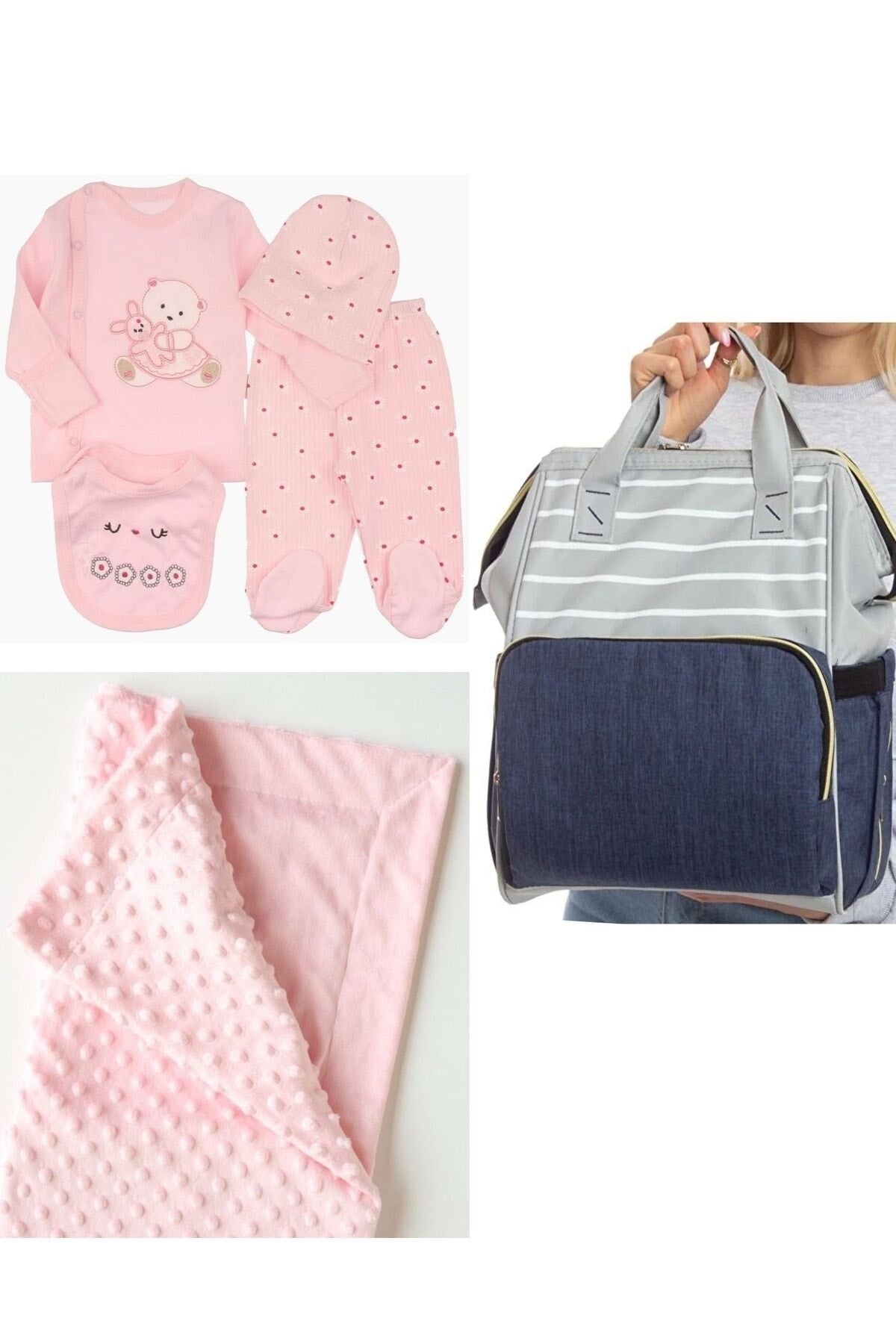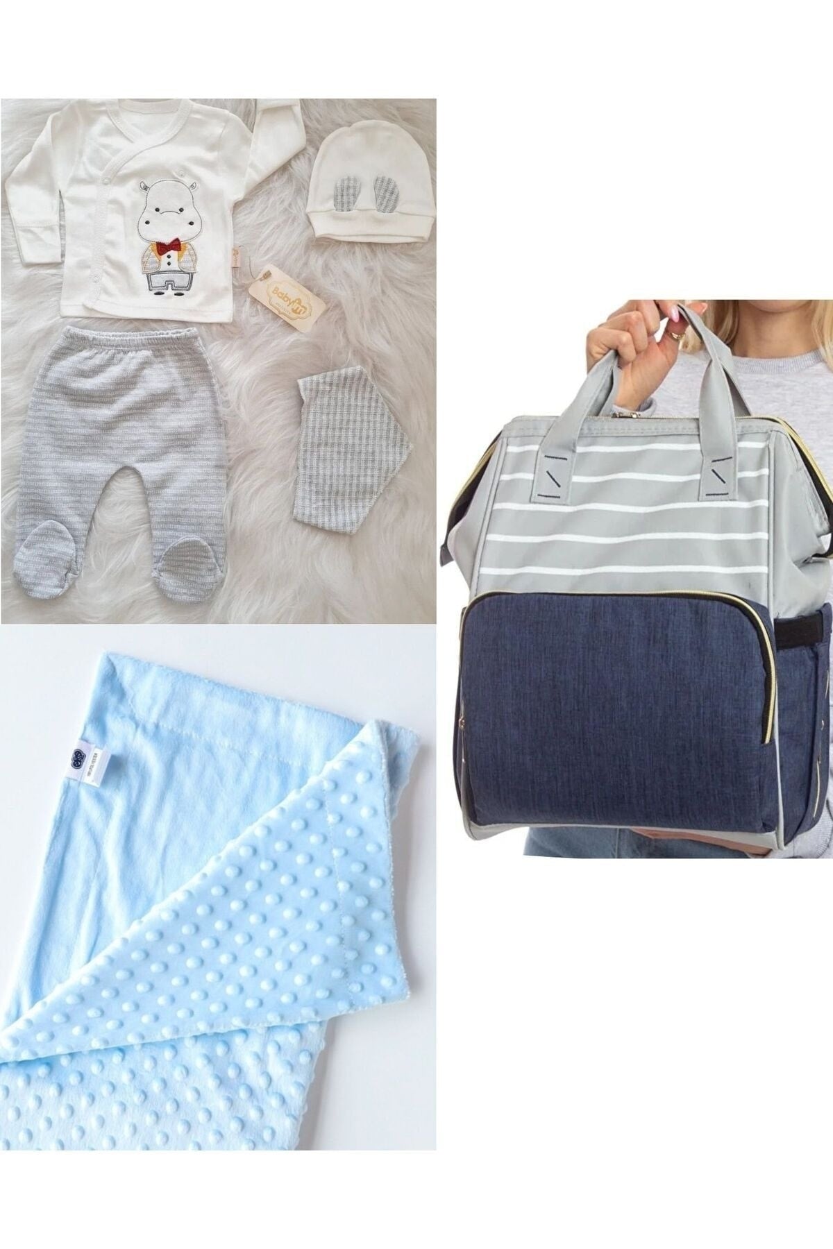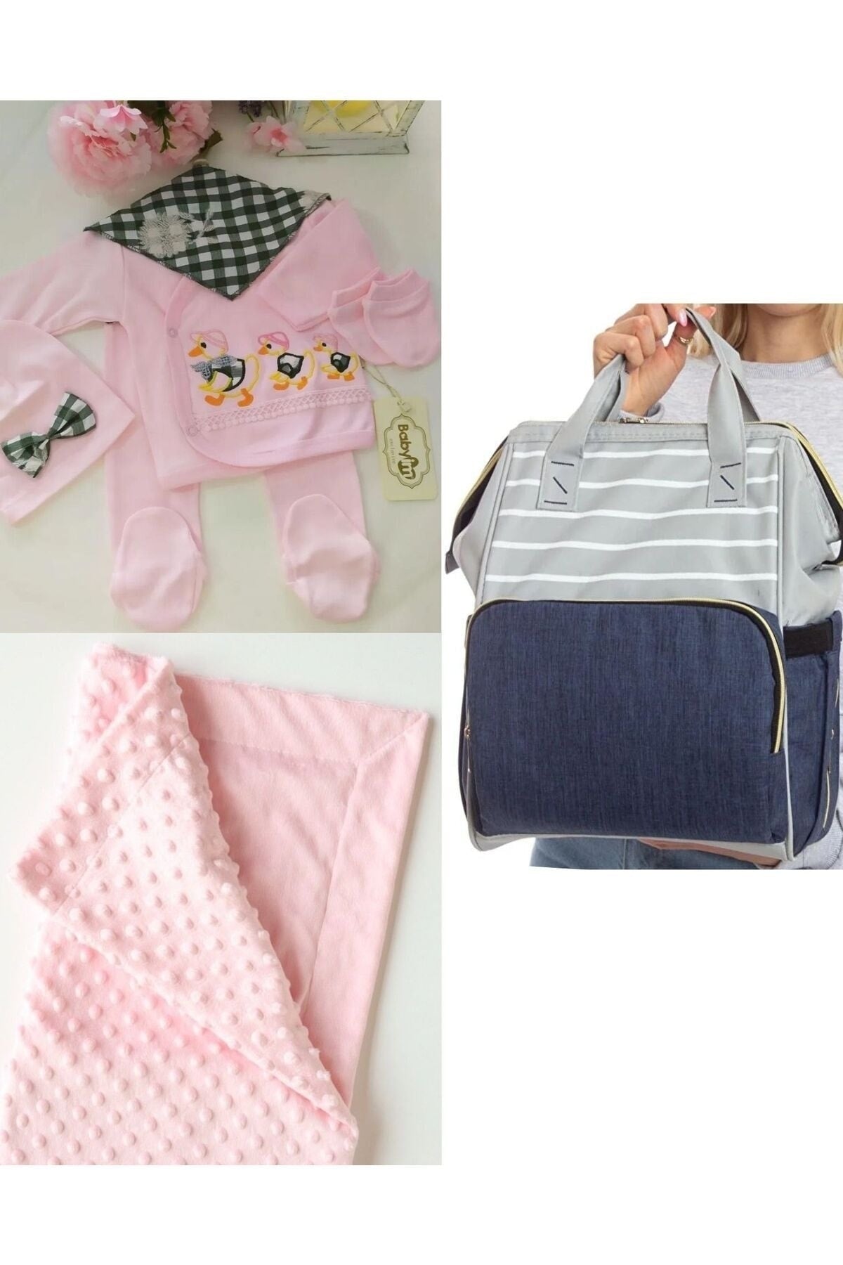 Functional Mother Baby Care Backpack, 100% Cotton Hospital Outlet And Chickpea Blanket Set