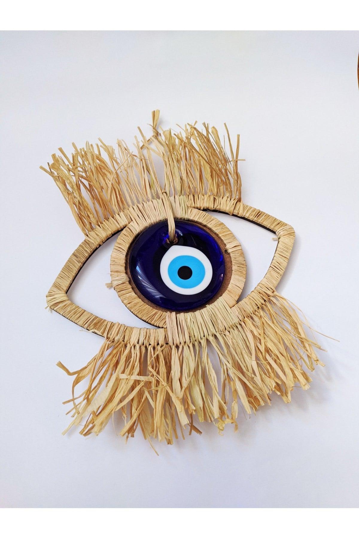 Duvar Dekorasyonu, Yeni Sezon, Rafya Ahşap Göz Modeli 20x20 cm Cam Kötü Göz Boncuk Duvar Süslemesi