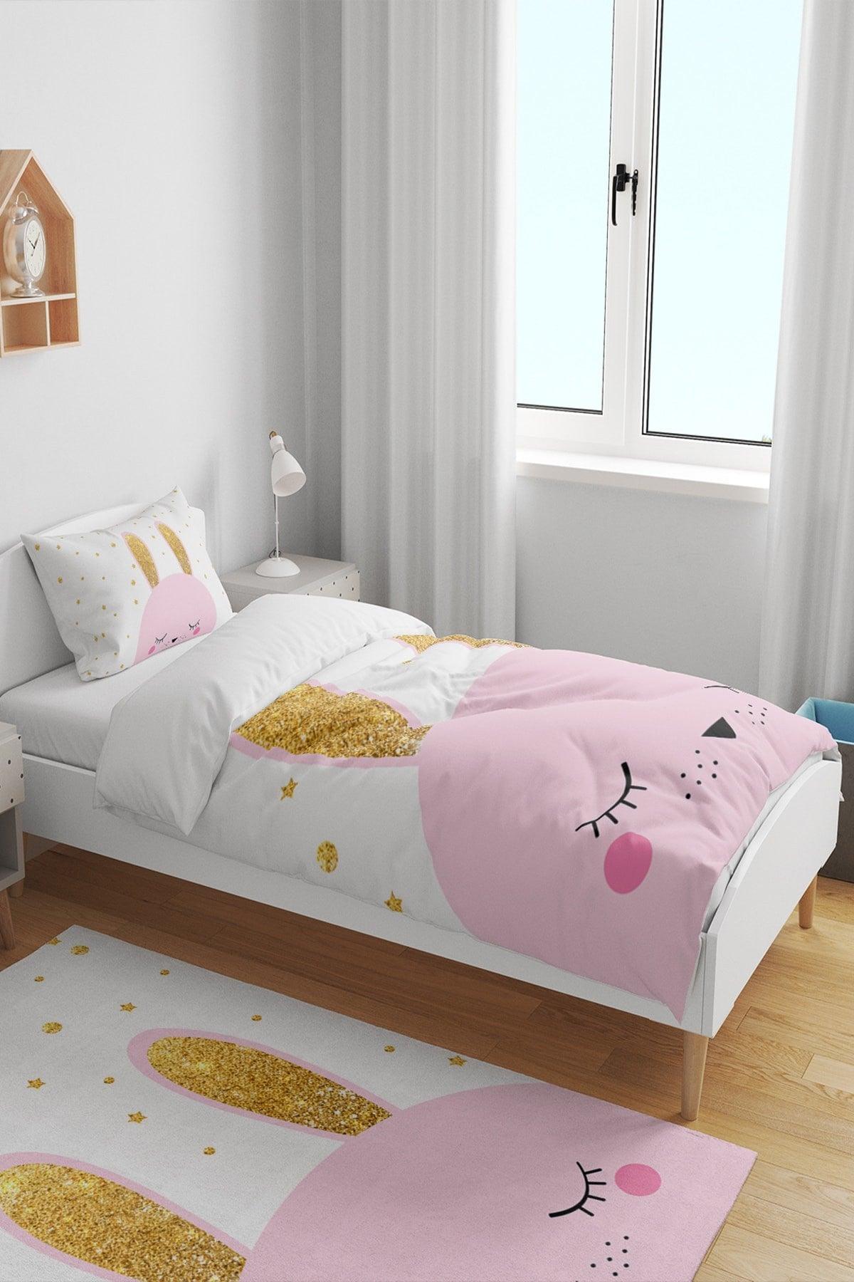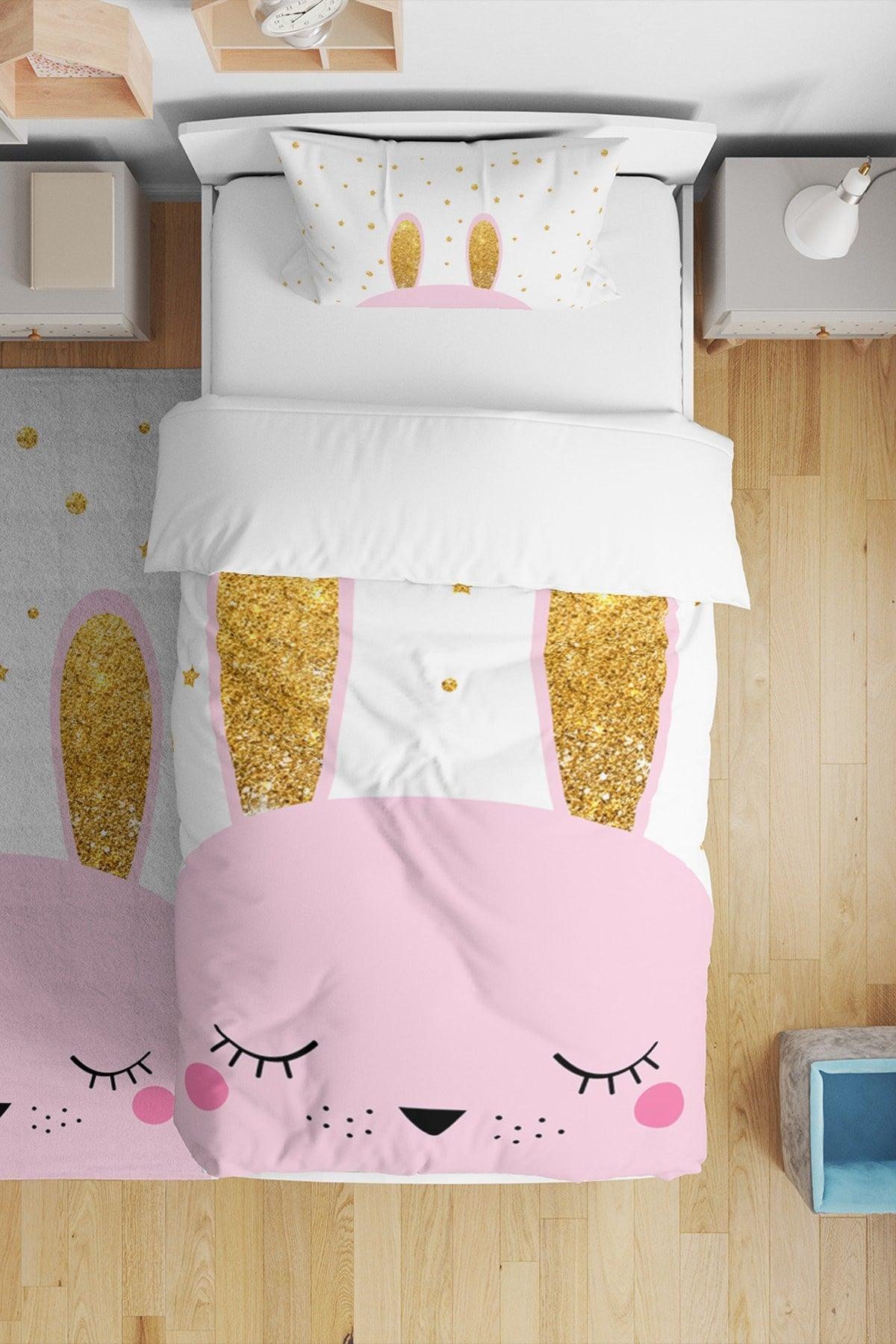 Pembe parıldayan tavşan desenli tek çocuk nevresim seti