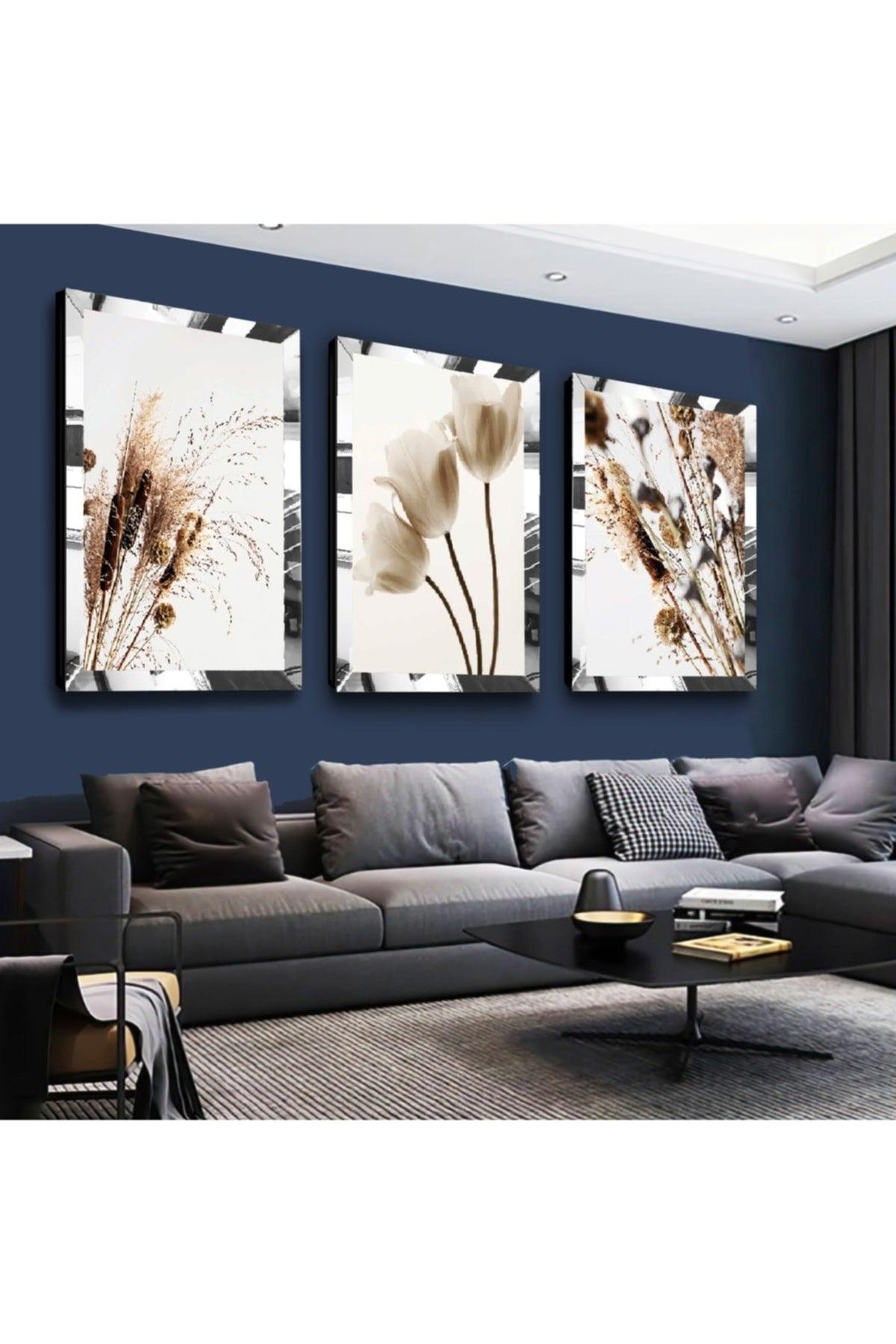 Beyaz Çiçek Gümüş Pleks Kenarı 3 Parçalı MDF Masa Seti