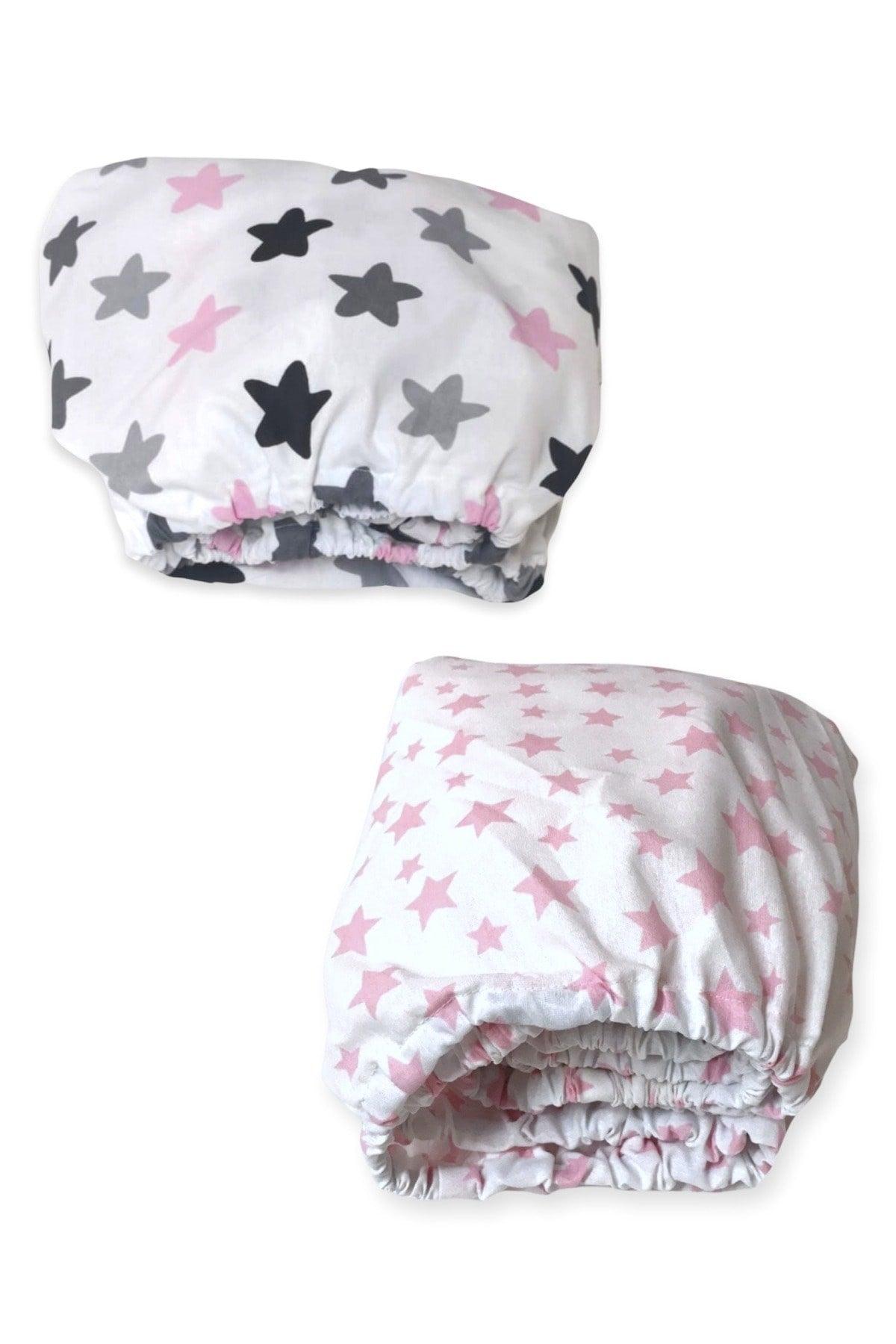 Pamuklu Bebek Çocuk Elastik Yatak Sayfası 120x200 (2 adet) Pembe Yıldızlar